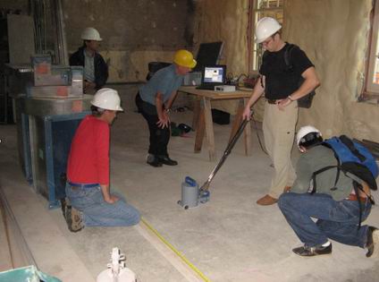 Fig. 1. The floor scan at the Fackenthal Hall in progress. The RASCAN head is being swept along the scan direction. The progress of the scan could be watched on the monitor behind.
