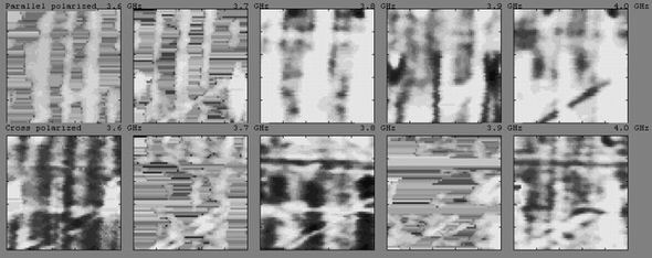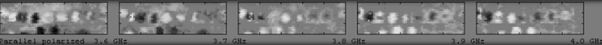 Figure 2. The display from the RASCAN software. The five frequencies from 3.6 to 4.0 Ghz are displayed from left to right and the two polarisations are parallel above and cross polarised below.