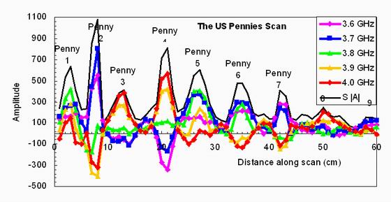 Figure 4 above, shows raw RASCAN data from a scan over 9 US pennies buried in sand at