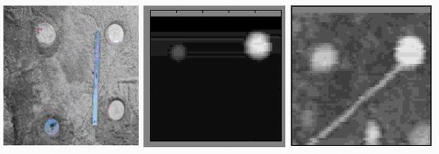 Figure 9. A scan from the garden in the University of Florence previously reported [1]. The mine simulant objects are shown on the left, the metal detector image in the centre and the composity single image on the right.