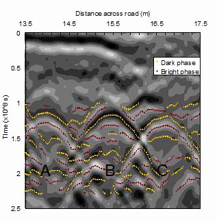 A radar antenna, placed just above the surface, is scanned across the objects to give a B-scan, defining the reflected intensity S(y, t) as a function of the round-trip time of flight t along the scan Y . Each buried object gives a generally hyperbolic pattern as the range becomes a minimum when the antenna is over the object, as shown in Fig. 1. This shows the conventional B-scan representation of the reflected intensity as a grey scale, representing reflected intensity, with time of flight t vertical, and distance Y across the road horizontal. The source was a FC = 600 MHz central frequency pulsed RIS model radar developed by the IDS company in Pisa, Italy [16]. The image is acquired with a time sampling of TS = 2.5 x 10-8s, and with a lateral step of 0.01 m. The average soil velocity V was estimated at 1.23 x 108 ms-1 and so the wavelength lC = V/FC = 0.205m and the time sampling TS corresponds to a distance V.TS/2 = 0.0154m. The problem is that in general there are many overlapping signals from the different buried objects, and many spurious signals arising from extraneous objects, such as stones, and from layered structures in the ground. The location was a test ground, and the nature of some objects was known. The inverted hyperbola in the center (denoted by B in Fig. 1) is known to be from a concrete pipe 0.36m in diameter, buried at a depth of about 1m. The reflection on the right-hand side, (C), is from an electric utility cable of 0.08-m diameter. The nature of the strong reflection to the left (A) is unknown. The different nature of the reflecting objects is shown by the phase of the principal reflected signal. The concrete pipe gives a dark-phase principal reflection with ringing satellite arcs above and below. The other two objects have a light-phase principal reflection with weaker satellites. The problem faced is clear. The reflections from the three main objects overlap to a considerable degree. Also there is considerable clutter noise from the nature of the soil, and to the top of the figure, rather intense flat signals representing the layered structure of the road. Presented here is an automatic method for isolating the reflected signals from any one object.
