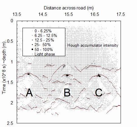 In this case, the accumulator space is only 2-D and is easily plotted in real space [Y, Z]. Fig. 2 shows such an accumulator space for the bright phase data pairs of Fig. 1. The results are for 100 000 random choices of data pairs. The spatial resolution of the accumulator space DY = 0.02m in the direction of the scan, and DZ = 0.015m in depth. These values are comparable with the lateral step of 0.01m and the time sampling distance of 0.015 m. Many of the iterations are not recorded and do not result in any increment to the accumulator space. For example, the solution may be imaginary, or the range of the solutions may lie outside specified ranges of interest. It is seen from Fig. 2 that the accumulator space shows a number of significant dark areas indicating the positions of hyperbolic arc apexes, including each of the three principal hyperbolas denoted by A, B, and C in Fig. 1. There is also a background of ignorance at around the 10% level, covering most of the area near the apex points. This background arises from plausible solutions, arising from data pair choices where one point may lie on the hyperbola of interest but the other lies on a different hyperbola, on a noise signal or on a soil layer signal. The resulting background may center on the apex of interest, but extends at a relatively uniform level over a wide area.