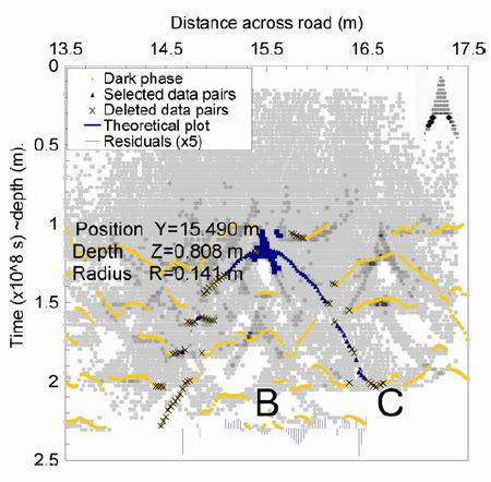 Fig. 4. Dark phase data pairs are shown by the light circles. The central object B gave the largest contributions to the Hough accumulator space, shown by the grey scale. The merged accumulator bins forming the apex are shown by the dark squares. The contributing data pairs for object B are shown by the dark triangles. The crosses are data pairs deleted by the threshold on contribution numbers. The results of a three-unknown parameter least-squares fit for the position Y , the depth Z, and the radius R at the velocity determined from peak C give the values shown in the figure. The full line is the best fit given by these parameters. At the base of the figure, the residuals are shown on a five-times expanded scale. At the top right in black, a simulation of a 0.18m pipe measured on a Y Z Hough transform shows the true form of the accumulator bin distribution.