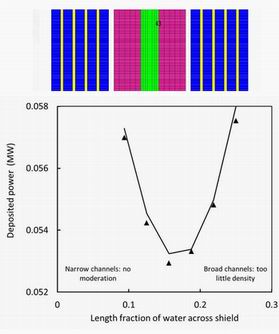 (blue) and water-cooling (yellow). On the right is the heat deposition as a function of the thickness of the water-cooling