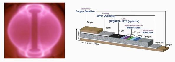 There were two developments in the 1990s which changed this. First, the START spherical tokamak at Culham, shown on the left of Figure 6, demonstrated that making the plasma the shape of a cored apple rather than a doughnut could give a higher plasma pressure. Secondly, the discovery of 'high-temperature' superconducting materials showed that the magnetic fields on the plasma could be much higher than previously thought. The right of Figure 6 shows the cross-section of the high-temperature superconducting tape. Most of the tape is copper stabiliser and substrate. The superconducting layer is only one micron thick.