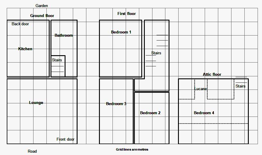 The house is on two floors with the back of the house (the kitchen side) a few steps lower. The attic covers the area of the lounge, above bedrooms 2 and 3.