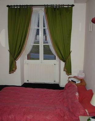 This bedroom has a view over the fountain to the forest. It has a nice old