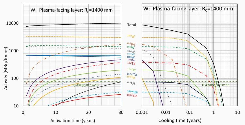 It is helpful to start with a monolithic tungsten shield in order to separate its activation from those of the borides. Figure 1 shows the rise in activation of monolithic tungsten over the 30 years of operating on a linear time scale, followed by its cooling off for 10 years on a logarithmic scale. Activation is plotted only for isotopes with an activity within 10-4 of that of the most active isotope. The decay results are qualitatively consistent with reported activation decay data for all the elements under ITER fusion spectra reported by Gilbert et al [14].