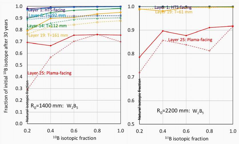 An increased isotopic concentration of 10B has long been used within the nuclear industry to improve the performance of neutron absorbing control rods and neutron counters [16]. Because of the 10% difference in nuclear mass between the two isotopes, and the relatively large (20%) natural abundance of the 10B isotope, the concentration can be increased relatively easily for example by gas diffusion [17]. It is available commercially [18]. The improved retention of the 10B isotope over 30 years of operations is shown in figure 10 for W2B5 shields with major radii of 1400 and 2200 mm. There is some statistical uncertainty, particularly in the plasma-facing layer, but at all depths in the shield and at both radii, there is a general improvement in isotope retention with 10B concentration. The majority of the possible improvement is achieved by 40% isotopic concentration. It is judged that, because of the rapid increase in retention fraction through the shield, its neutronic performance is unlikely to be appreciably changed. The effects of water-cooling layers in the retention factor are shown by the dashed lines and open symbols. Its effect is again seen to decrease the retention factor.