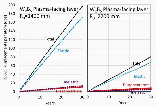 atom as given in table 9 on page 126 of [13]. Figure 11 shows for W2B5 shields of major radii 1400 mm and 2200 mm, the FISPACT-II cumulative dpa values for the fluxes at the plasma-facing side of the shield. The dpa is divided into the component from elastic scattering processes, from inelastic processes and from capture or disappearance processes when the particle is lost. All the plots are seen to be very close to linear in irradiation time, so that further discussion will be limited to the 30-year dpa values.