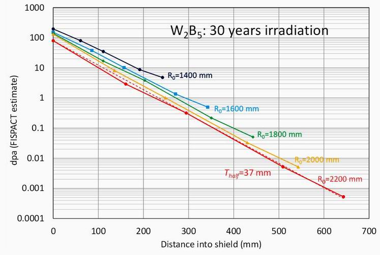 In figure 4 the activation is plotted as a function of distance into the shield. For the boride materials the decay is close to exponential except near the HTS-facing surface. For W and WC shields there is more curvature in these plots. Exponential fits to this region are shown dashed with the half attenuation distances listed for each material in the legend.