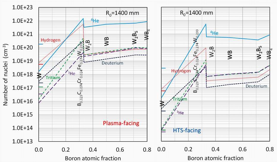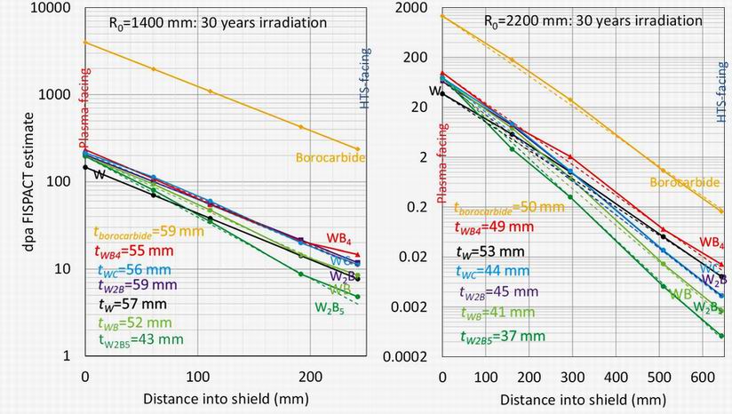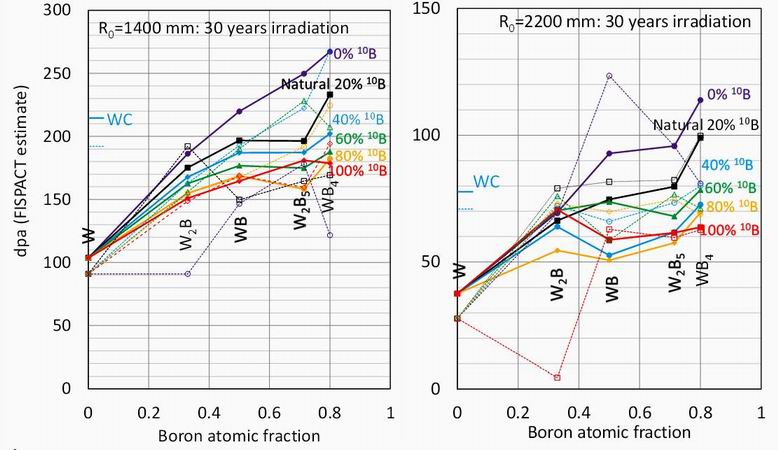 Quantitative assessment of activation product data for the tungsten carbides and borides is yet to be reported. Oliver et al [8] proposed that in WC, Re, Ta, and Os production would likely lead to the precipitation of secondary carbides, particularly TaC. Neutron irradiation studies of slightly porous coarse-grained W2B5 have led to swelling, embrittlement, and eventual fracture due to helium production [9]. Although the material performed well compared to the other candidate borides based on metals in groups IV-VI (Ti, Zr, Hf, V, Nb, Cr and Mo). Activation product release of He and Li and 10B burn-up have been characterised in neutron irradiated group IV-V metal borides [10], although this study excluded any tungsten borides. Isotopic tailoring of 11B may be necessary if borides are to be used as structural materials [11]. The activation of the core materials including the HTS tapes, their insulation, copper matrix and inconel structure will be discussed in a later paper.