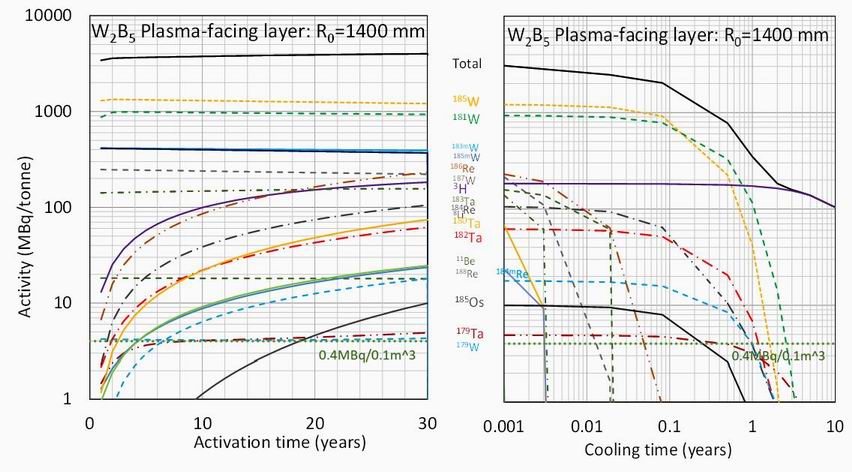 Figure 2 shows that the boron included in the monolithic W2B5 shield gives generally only around half the activation, caused largely by the lower tungsten atomic density in W2B5 compared to W. It does introduce 8Li as a significant immediate activation product, while tritium 3H is important in the cooling period, where it becomes dominant after about a year. It is noticeable that the actual activation for the W2B5 after 30 years of operations is 4005 MBq/tonne, which is appreciably less than the 10120 MBq/tonne for monolithic tungsten, despite it being a much better shield. This could be a considerable advantage in the case of a loss-of-coolant event.