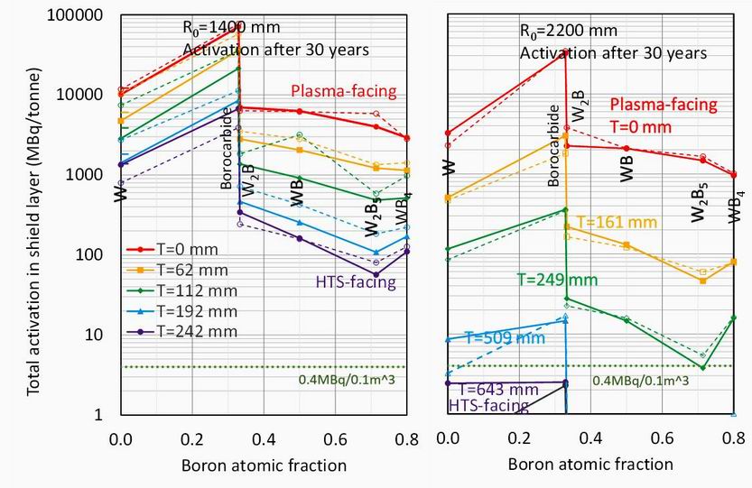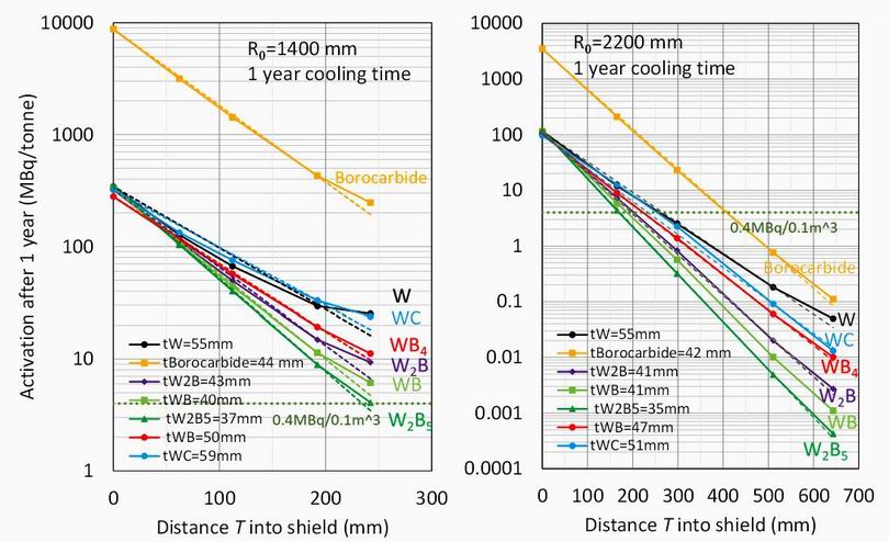 Figure 3. Figure 3 compares the activation of all candidate materials after 30 years of operation. The borocarbide B0.329C0.074Cr0.024Fe0.274W0.299 shield contains a considerable fraction of iron and chromium and soon builds up 55Fe and 54Mn isotopes which give the material higher activation at 1400 mm radius than all the other materials considered. Since tungsten itself activates strongly, it is not surprising that the activation generally decreases with boron atomic fraction, but the decrease is not large at the plasma-facing side, because the neutron fluences there are similar. However further into the shield at lower (and more varied) fluences, the activation depends more strongly on the boron content. The fluence was shown in figure 6 of [1] to depend on boron atomic fraction very much like the activation dependence seen here.