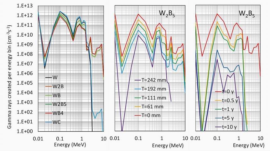 FISPACT-II calculates the energy spectrum of the gamma rays created per unit volume and unit time from the irradiation products. In the present computations the spectrum covered energies between 0.01 and 10 MeV. Figure 5 (left) shows the gamma energy spectrum from activated isotopes for the different materials considered after irradiation for 30 years. The dependence on material can be seen most notably by the marked increase in the spectrum above 2.5 MeV for boride materials, which increases steadily with boron content. In contrast the spectrum in the range 0.05-1 MeV decreases slightly with boron content, suggesting that emission processes in this range are dominated by tungsten. The spectrum from all the shield materials differs little during the 30 years of irradiation and is therefore not shown.