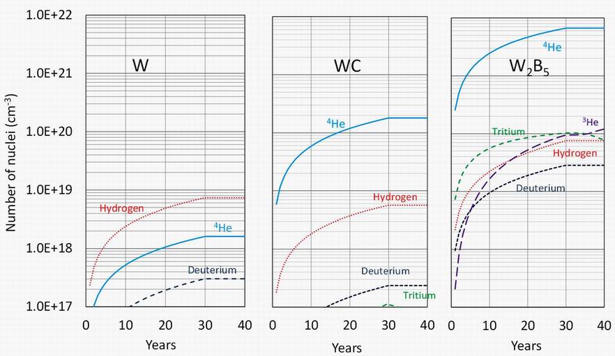 Figure 6 illustrates the production of gaseous nuclei for monolithic W, WC and W2B5, and their decay during the 10 years cool-down. It is seen that with monolithic tungsten the only significant gaseous isotopes are the stable hydrogen, 4He and deuterium. For WC there is appreciable production of alpha particles 4He, while the production of hydrogen 1H and deuterium 2H is similar.