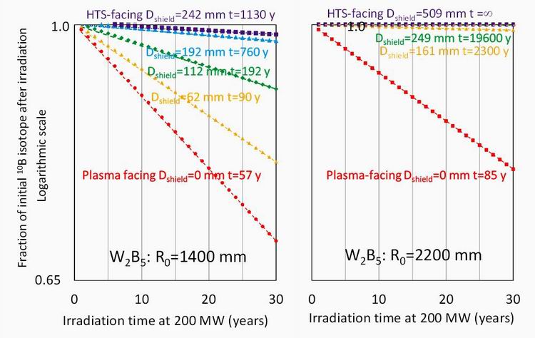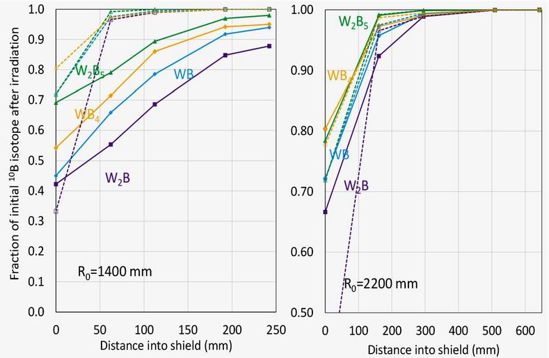 The dashed lines in figure 9 show the corresponding values for shields containing 5 layers of water occupying roughly 1/5 of the shield total thickness as detailed in [1]. These have a role in cooling the shield but also in moderating the neutrons. The figure shows that including the water layers has an appreciable effect on the 10B retention factor. At a 2200 mm major radius, the plasma-facing fraction tends to decrease, considerably so for W2B, but then improves more rapidly with distance into the shield soon becoming better than that for monolithic shields. This effect is of practical importance in reducing the operational time before replacement of the plasma-facing layer of the shield due to an unacceptable reduction in the 10B retention fraction.