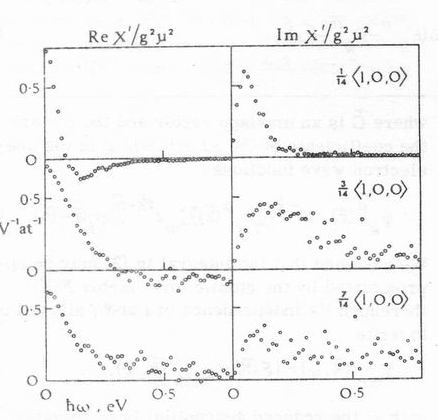 Figure 1 shows both real and imaginary parts of the unenhanced, reduced, tight-binding susceptibility at 1020 0K for three of the 14 selected values of K along the <100> direction. Where the comparison with a free-electron gas is meaningful, i.e., the central part of the zone, the results are very strikingly similar to those for a free gas. The limiting lines of our c' at small K and w are those-of a free gas of Keff= 1.3 +/- 0.1 Ǻ -1 and EF= 0.37 +/- 0.03 eV, which are almost exactly the free-gas values giving the best fit of Lowde and Windsor to the experimental data.