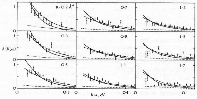 A corresponding set of fits with the completely absolute calculation corresponding to the solid lines in Fig. 2 can be made only if the data for hw/2p 0.05eV are ignored on the assumption that the discrepancy at higher energies may be disregarded for some unknown reason. We cannot justify abandoning the higher energy measurements, but it is reassuring to note that if the absolute calculation be fitted where it can be, below 0.05 eV, an equally nearly constant Ieff(k) is obtained of mean value 0.52 +/- 0.04 eV. The reason is that the K dependence of the enhancement is much more pronounced at low energies; the two fits, taken together, suggest that the observed virtual independence of K is a feature of the work not particularly sensitive to the detailed explanation assumed.