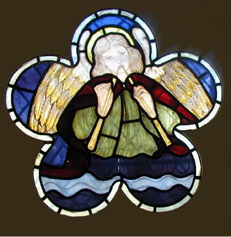 An angel playing the Aulos with two pipes, seen this August at the stained glass exhibition at Ely cathedral.
