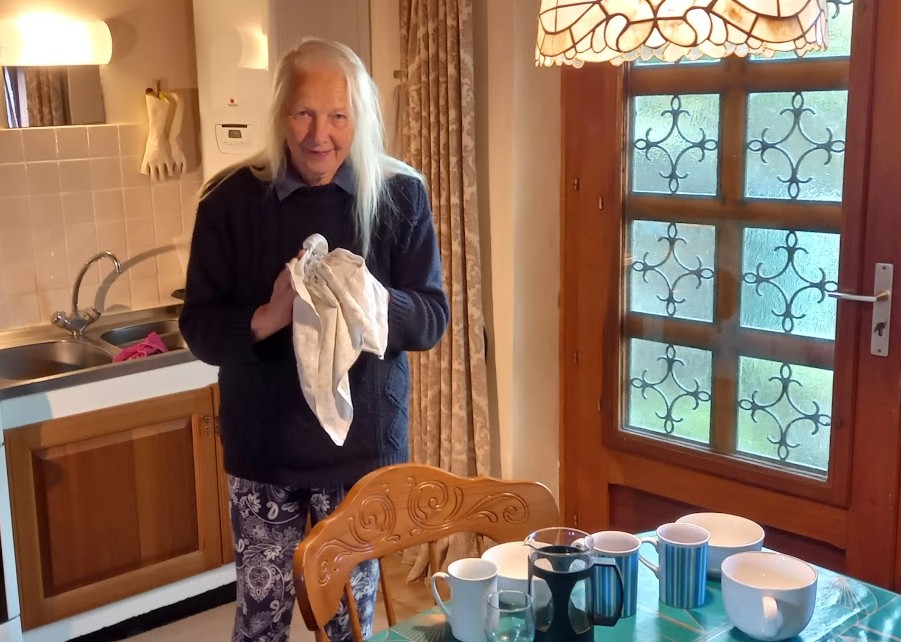 Mo washing up after our breakfast. Now my son Jon has installed a dishwasher