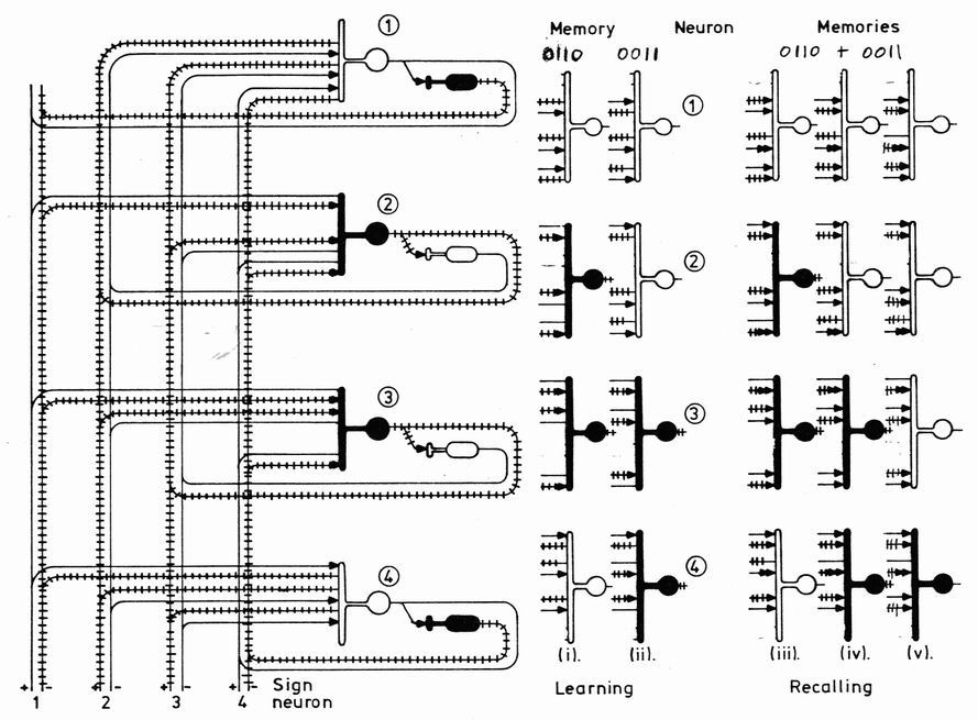 This has a magic all its own. During recollection the synapse strengths remain at their values during memorising. A seed pattern (representing a hazy thought. An imperfect guess at a pattern) will, under a few thresholding procedures per neuron, approach the stable firing pattern it most closely resembles. Partial information will have recalled complete information, and this will have been retrieved through its content, not its location. Column (v) in figure 2 is an example of the seed firing pattern 0001. Neuron 3 has the thresholding sum of 4 and turns on to give our stable memorised pattern 0011. However, the choice of neuron must be taken randomly. Had we chosen neuron 1, the sum would have been 4, so the neuron would have switched on to give the pattern 1001 (the inverse of the other pattern). However, the stable state may not be one of the desired memories. If we try to remember too much - say if the ratio of stored pictures to neurons is larger than about 15% - then a random nonsense pattern may be obtained.