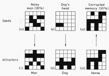 Figure 3 Some examples of the performance of a 25-neuron pair network, with synapse strengths calculated from the superposition of those for the attractor pictures (i), (ii) and (iii). Seed (iv) shows the man with 30% of the pixels changed in sign; it successfully follows the arrow to the correct attractor. (v) has just a fragment of the dog (his nose); again it is sufficient to find the correct attractor. (vi) shows the effect of corrupting 30% of the synapse strengths to random values. Using the horse (iii) as a seed gives the new attractor (vi), almost unchanged from the original.